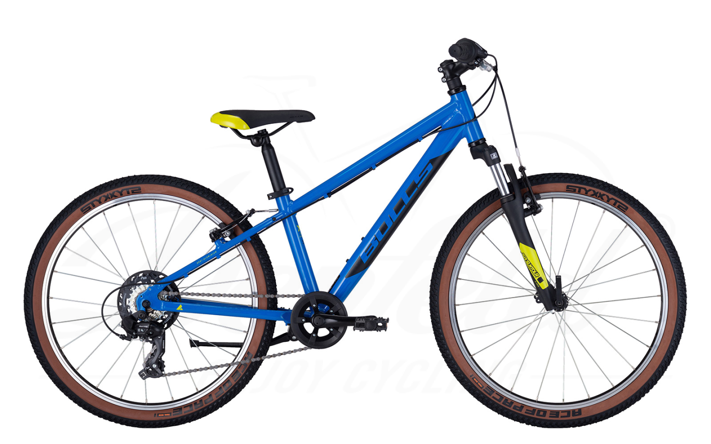 Der Aluminium-Rahmen in sportlicher Diamant-Rahmenform ist besonders hübsch in einem kräftigen Blau-Ton. Federgabel an der Front, 24 Zoll Laufräder. Coole 2.0er MTB-Reifen dürfen hier nicht fehlen.