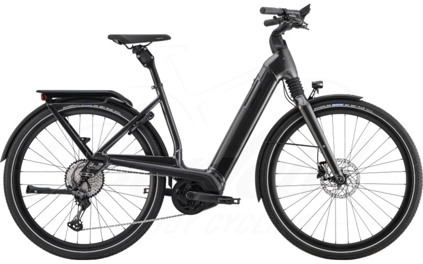 Das schwarze Cannondale Mavaro Neo bietet Ihnen eine aufrechte Sitzposition und mit der Wave Rahmenform einen bequemen, tiefen Ein-/Ausstieg. Der Aluminiumrahmen aus C1, robust und langlebig, hat den Akku herausnehmbar im Unterrohr sitzen. Für die klare Optik sorgen die innen-verlegten Züge. Praktisch platziert, schön weit oben: Die Befestigungspunkte für eine Trinkflasche befindet sich am Steuerrohr direkt unterm Lenker. Hier befindet sich auch die einfach zu erreichende Ladebuchse.